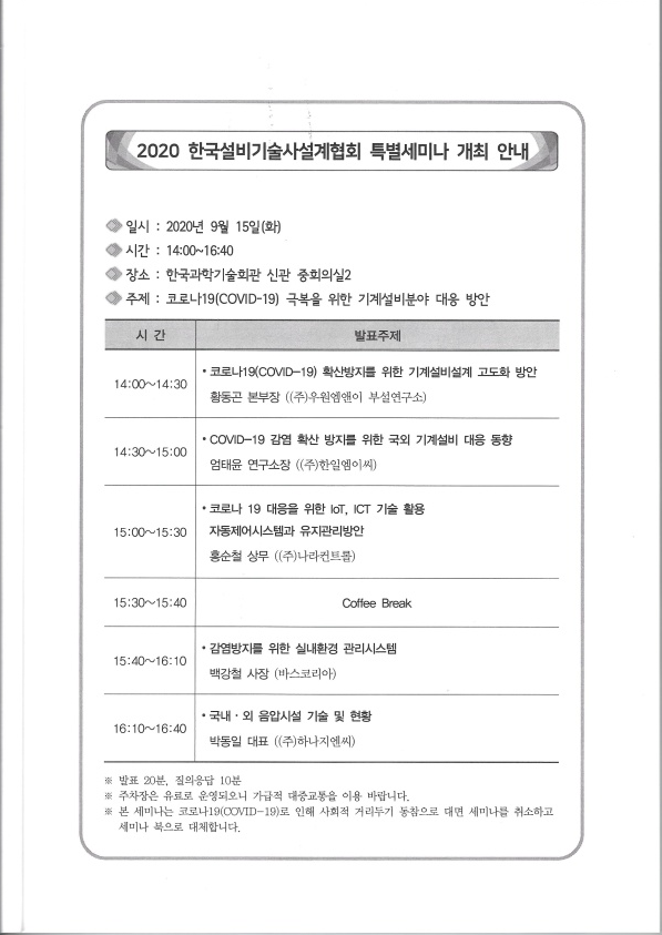 2020 한국설비기술사설계협회 특별세미나가 2020년 9월 15일(화) 한국과학기술회관 신관 중회의실2에서 한국설비기술사설계협회 주관으로 개최되었습니다.