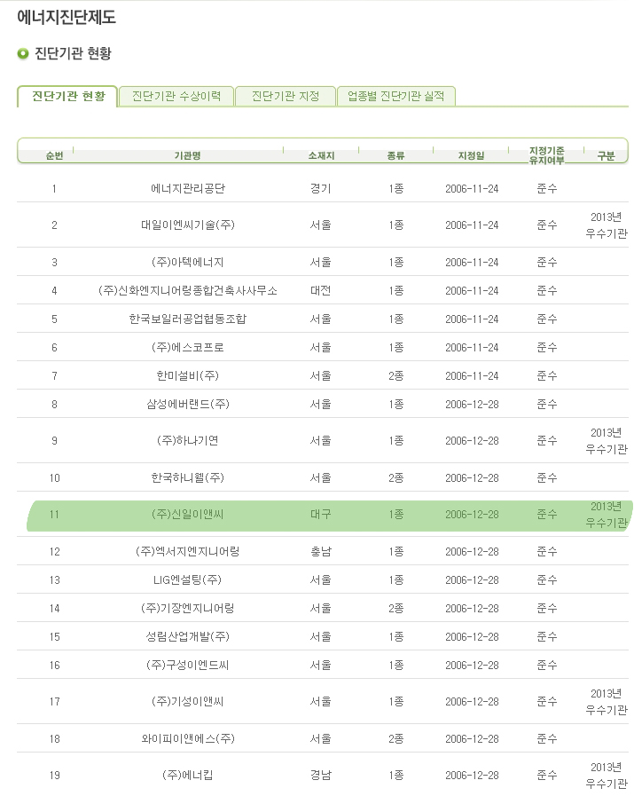 에너지관리공단에서 시행하는 에너지진단기관 평가에서 (주)신일이앤씨 외11개의 기관이 2013년도 에너지진단 우수기관으로 선정