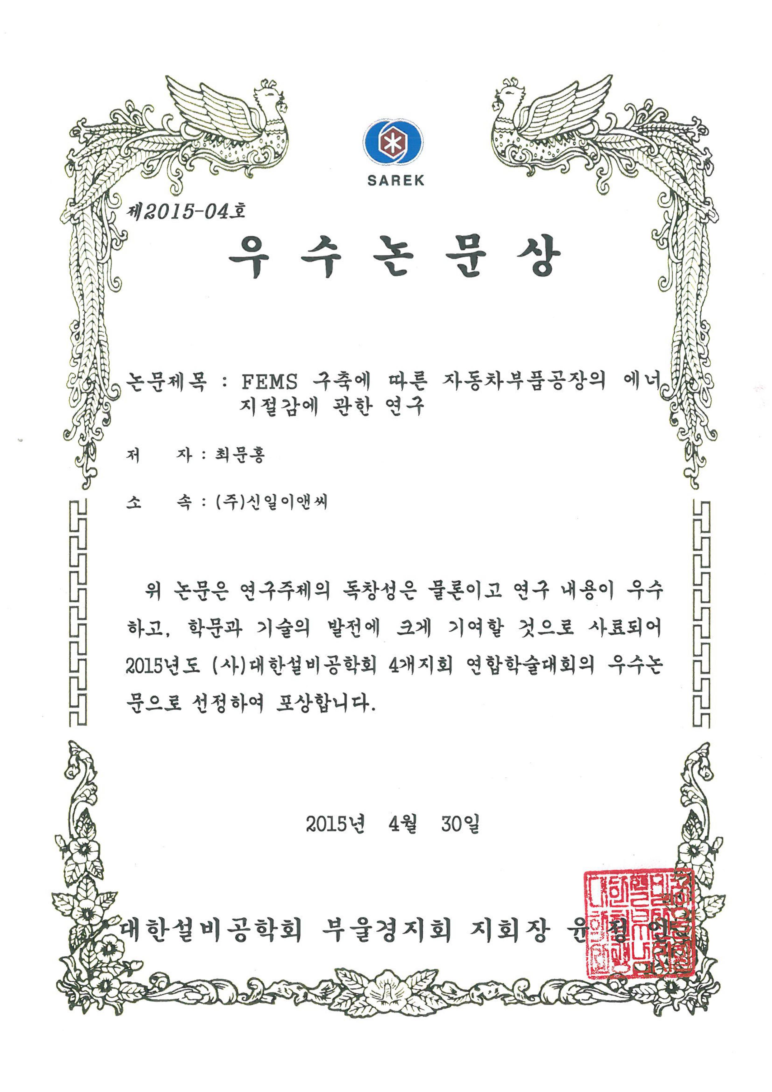 ▲ 2015년 대한설비공학회 4개지회 연합학술대회에 (주)신일이앤씨 최문홍 대표이사가 우수논문상을 수상하였습니다.
