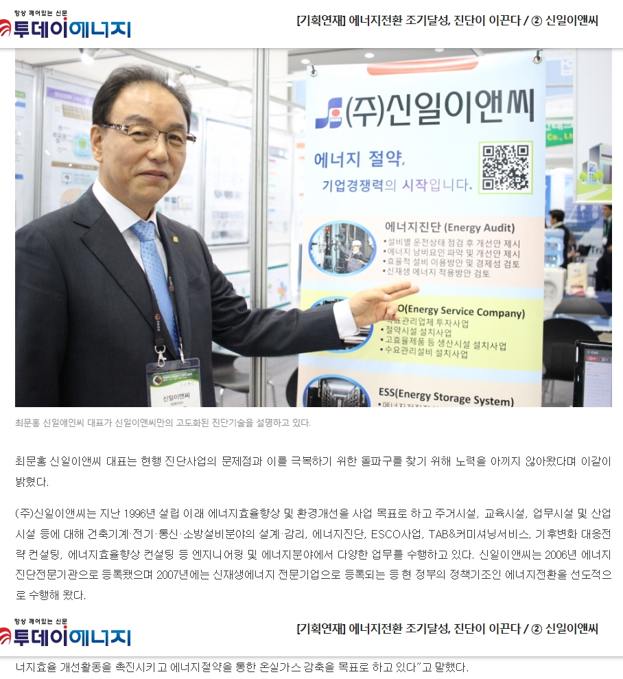 | "투데이에너지 신문사 에너지진단관련 기획연재"(주)신일이앤씨_2019.04.09 기사 | |